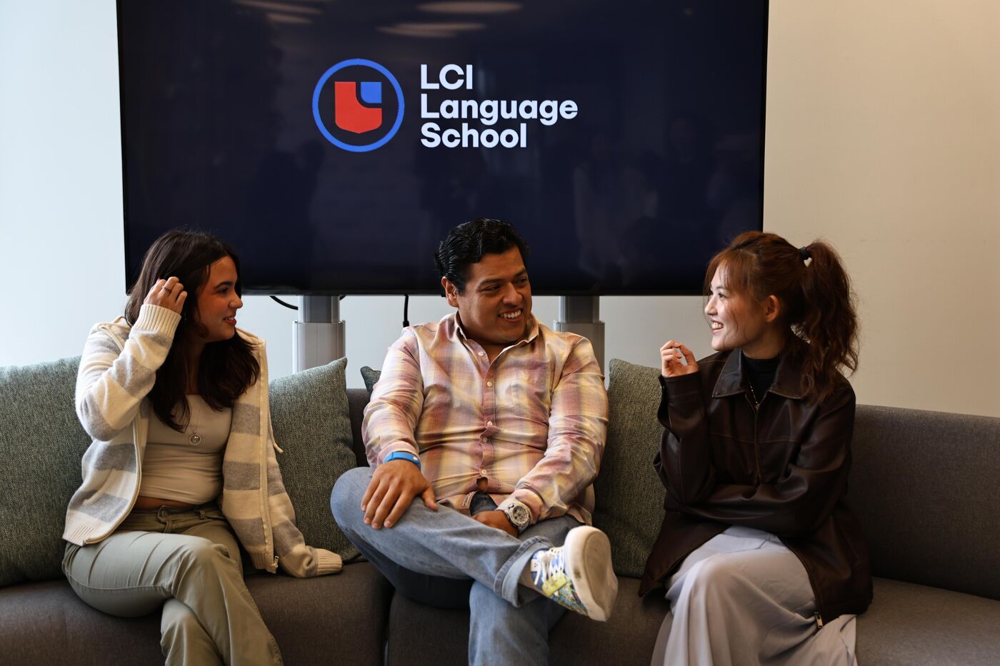Three individuals are posing in front of a backdrop adorned with the logo of LCI Language School. The backdrop also features silver balloon letters spelling out "LCI". The people in the image are smiling and appear to be associated with the language school.